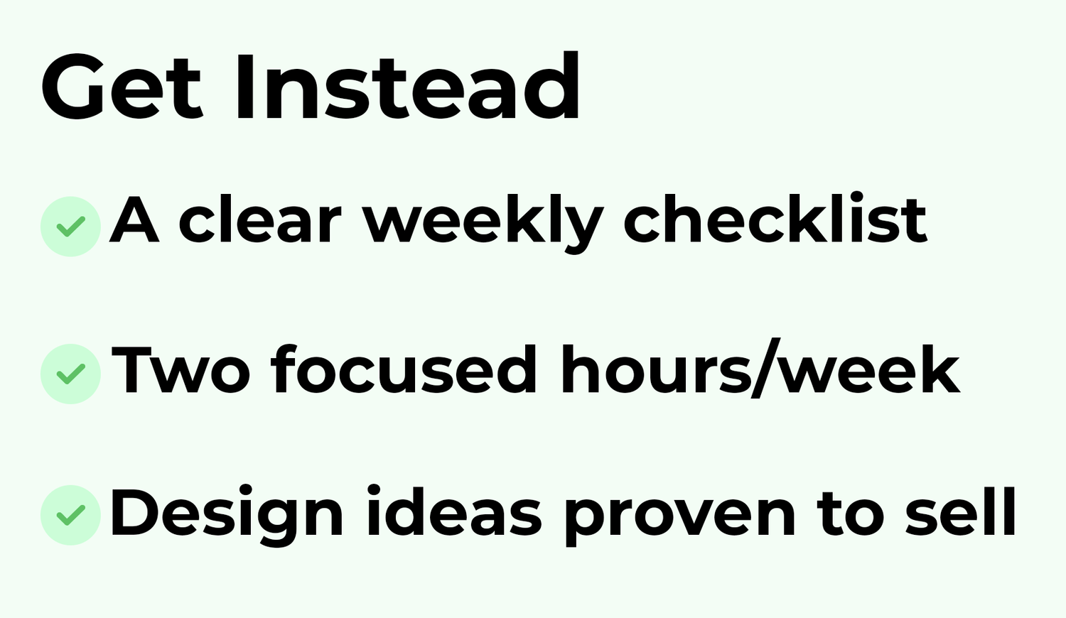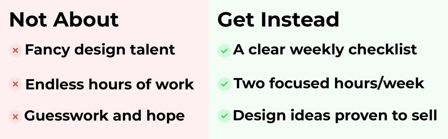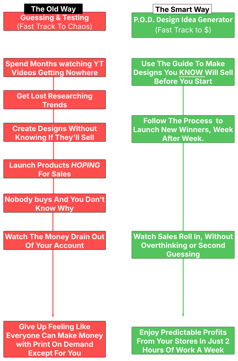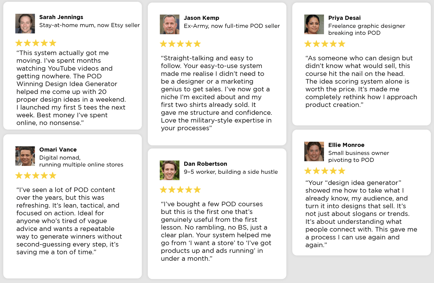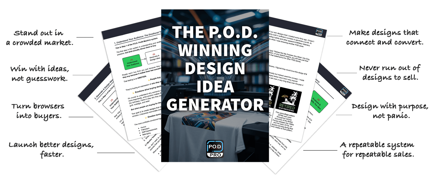 The result is the P.O.D. Winning Design Idea Generator, a military‑grade 3‑step system that turns ideation chaos into predictable launch routines, designed to generate 3 buyer-ready designs in just 2 hours every week, even if you're not a designer.