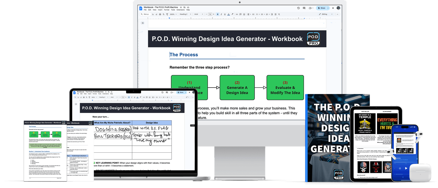 You're getting immediate access to the highly praised P.O.D. Winning Design Idea Generator. It comes as a Google Doc that you can copy and edit for your own use. We chose this format so you can take notes, highlight key steps, and return to it anytime as your business grows. You’ll also get the accompanying workbook, packed with guided examples to help you apply the system to your own niche. It becomes your go-to reference every time you create new designs. And you’ll get the Niche Validation Tool, Weekly Workflow, The Weak Or Winner Breakdown, and the POD Acronym Glossary.