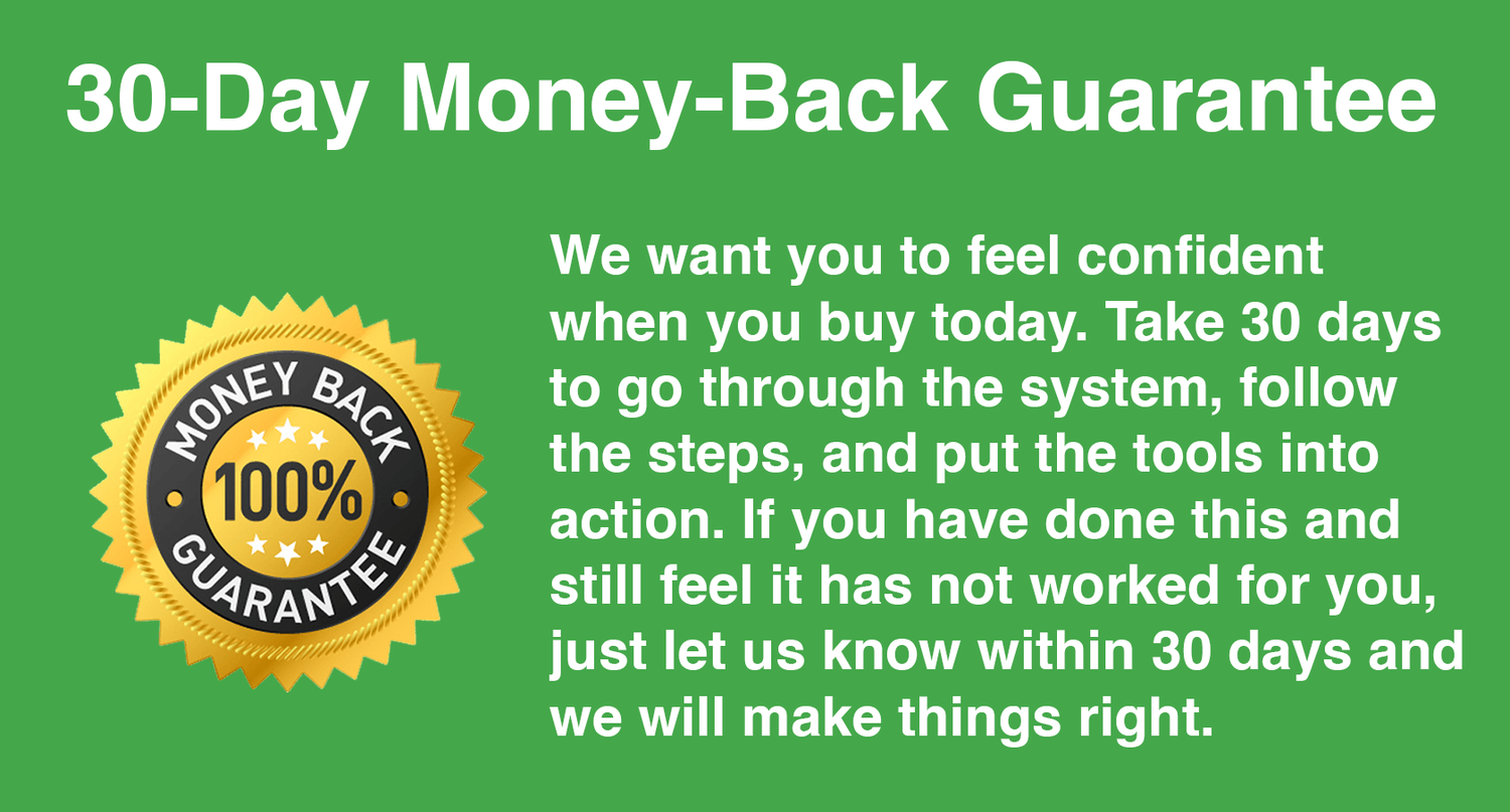 We want you to feel confident when you buy today. Take 30 days to go through the system, follow the steps, and put the tools into action. If you have done this and still feel it has not worked for you, just let us know within 30 days and we will make things right.